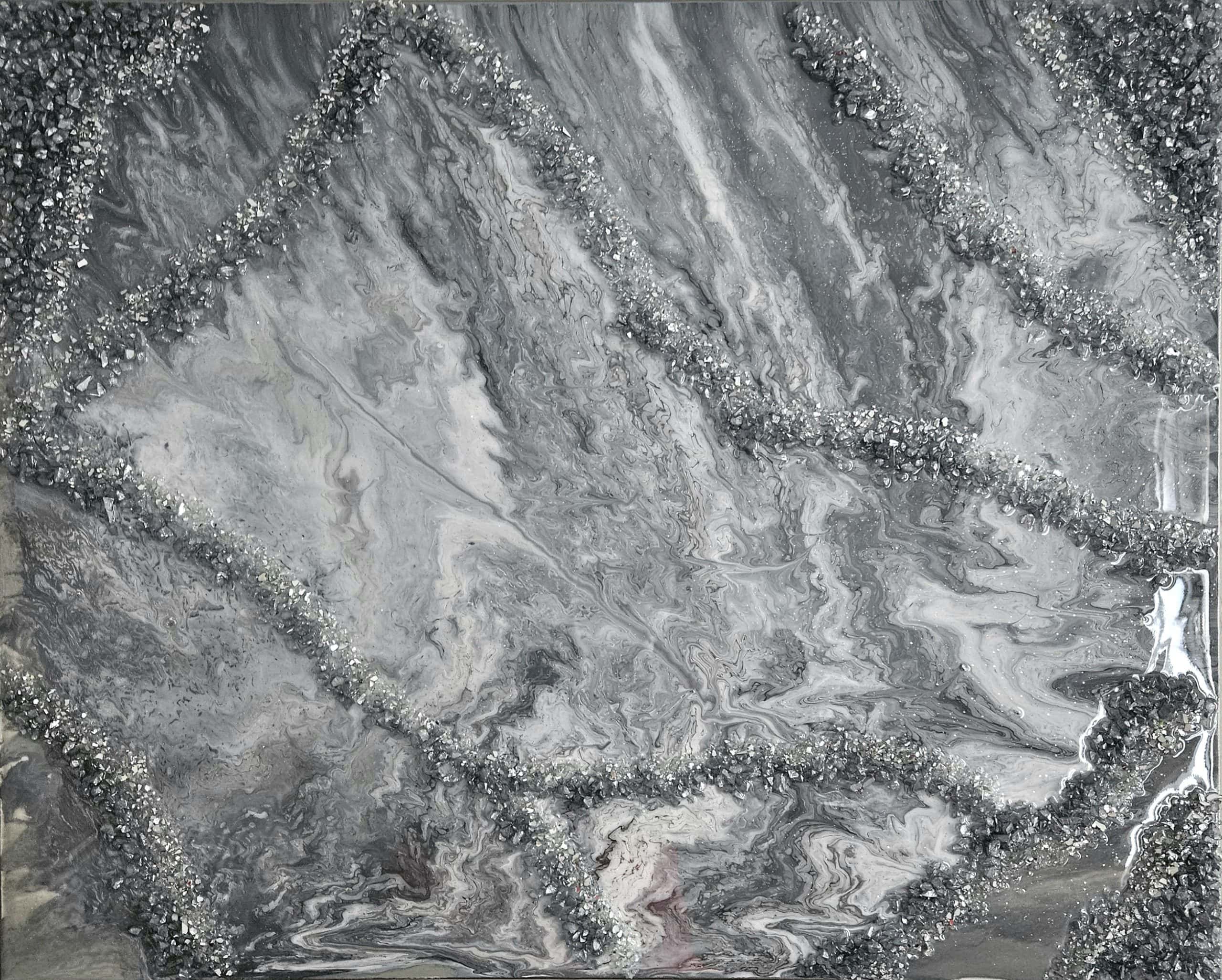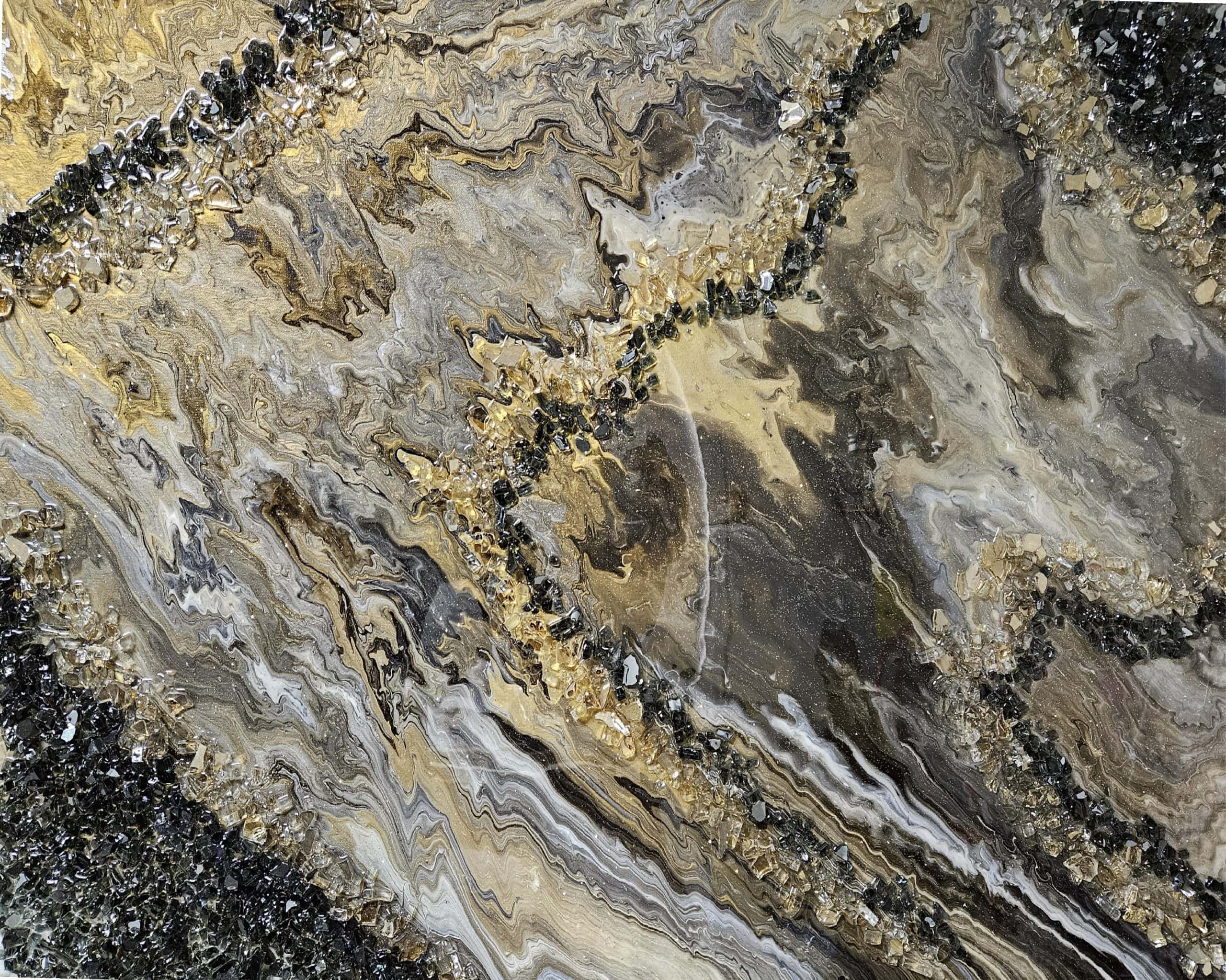 In Divine Persuasion, the artist presents a high-drama exploration of geological luxury. This mixed-media work utilizes a powerful palette of deep black, brilliant gold, and shimmering silver to create a topography that feels both primordial and incredibly refined.
